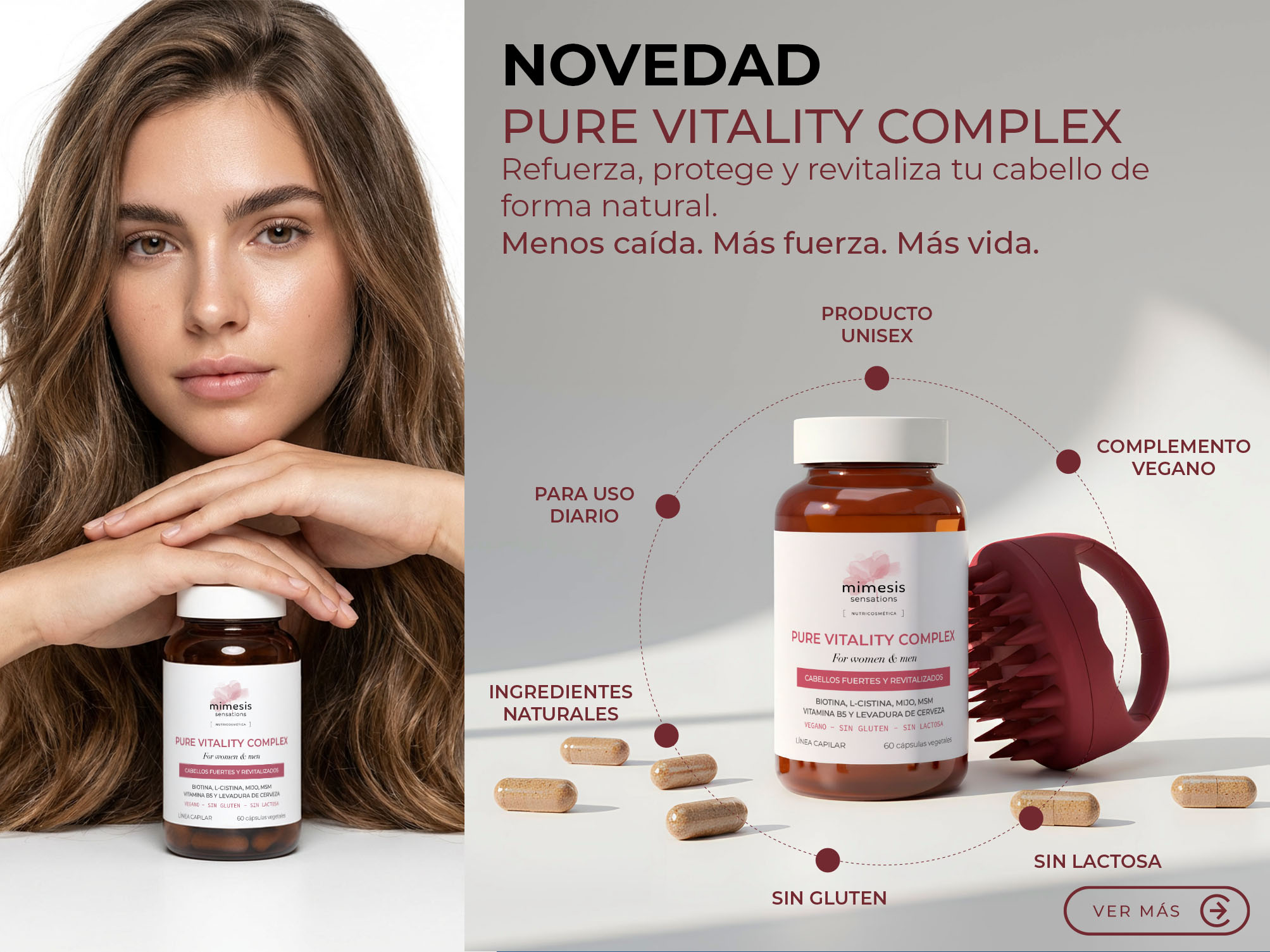 Protege, fortalece y revitaliza tu cabello de forma natural gracias a Pure Vitality Complex. Su fórmula combina L-cistina, extracto de mijo, MSM, levadura de cerveza sin gluten, vitamina B5 y biotina.